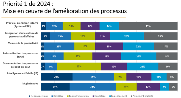 En 2024, cette amélioration des processus visait principalement l’intégration de systèmes ERP, la mise en place d’une fonction finance mettant de l’avant une approche de partenariat et l’automatisation des processus (en considérant à la fois les organisations pleinement implantées et celles en cours d’implantation (rolling out)). Pendant ce temps, la mesure de la productivité, la documentation des processus et l’intégration de l’intelligence artificielle étaient reléguées au second plan.