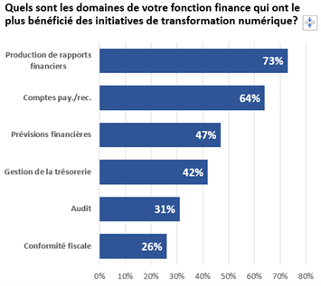 Dans cette même étude de 2025, lorsque l’on a demandé aux organisations quels ont été les domaines pour lesquels la fonction finance a profité le plus des efforts de transformation numérique, on constate que ce sont la production de rapports financiers (73 %) et les comptes payables/recevables (64 %) qui ressortent du lot.