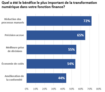 De plus, lorsqu’on leur a demandé quel a été le bénéfice le plus important de la transformation numérique pour leur fonction finance, les avantages les plus cités étaient la diminution du nombre de processus manuels (72 %), une précision accrue (65 %), une meilleure prise de décision (55 %) et une économie de coûts (54 %).